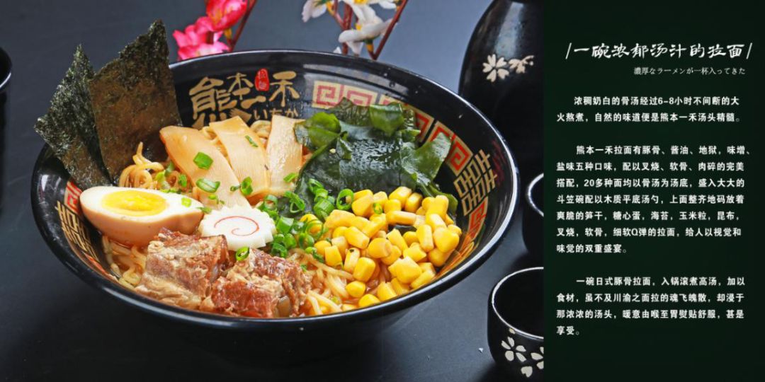 拉面:浓稠奶白的骨汤经过6-8小时不间断的大火熬煮,自然的味道便是熊本一禾汤头精髓。熊本一禾拉面有豚骨、酱油、地狱,味增、盐味五种口味,配以叉烧、软骨、肉碎的完美搭配,20多种面均以骨汤为汤底,盛入大大的斗笠碗配以木质平底汤勺,上面整齐地码放着爽脆的笋干,糖心蛋,海苔,玉米粒,昆布,叉烧,软骨,细软Q弹的拉面,给人以视觉和味觉的双重盛宴。一碗日式豚骨拉面,入锅滚煮高汤,加以食材,虽不及川渝之面拉的魂飞魄散,却浸于那浓浓的汤头,暖意由喉至胃熨贴舒服,甚是享受。
