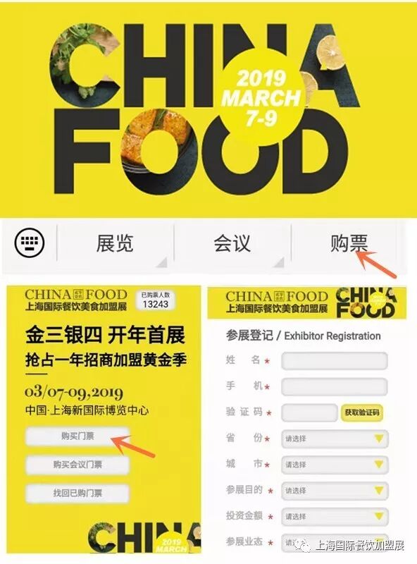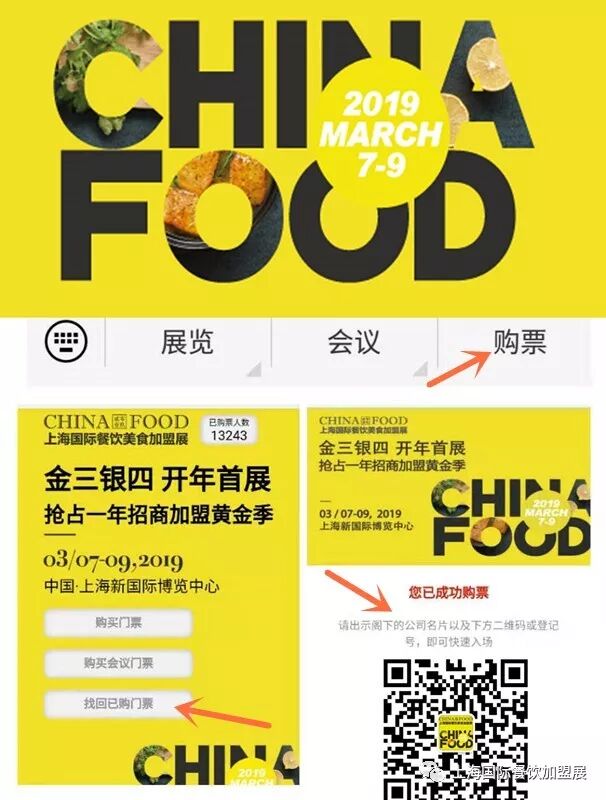 本次展会采用手机自助扫码购票的形式,关注公众号“上海国际餐饮加盟展”,点击菜单栏内右下角的“购票”,按照流程填写信息完成自助购票,凭借成功购票二维码页面至柜台兑换门票进入场馆参观。一人一证,转让无效。