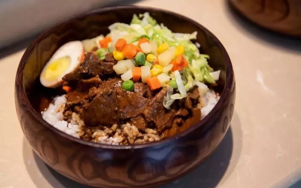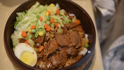 牛肉饭里还有卤蛋、玉米、土豆和蔬菜,荤素搭配,一看就非常营养!也特别适合小朋友们吃。