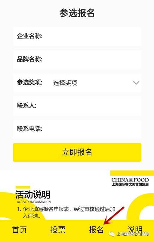 3、品牌如想报名评选奖项,需点击菜单栏底部“报名”,填写“报名申请表”,经过审核通过后加入评选,参与投票品牌需是门店数2家以上的餐饮企业