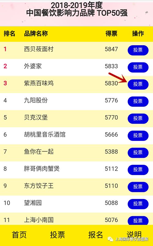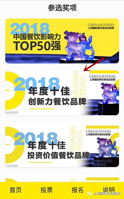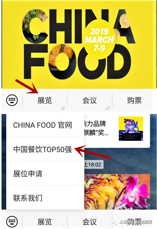 1. 现在大家可以为喜欢的品牌进行投票啦,想要参与投票的观众,可以在本微信公众号的菜单栏 “展览” - “中国餐饮TOP50强” 中,点击“投票”功能