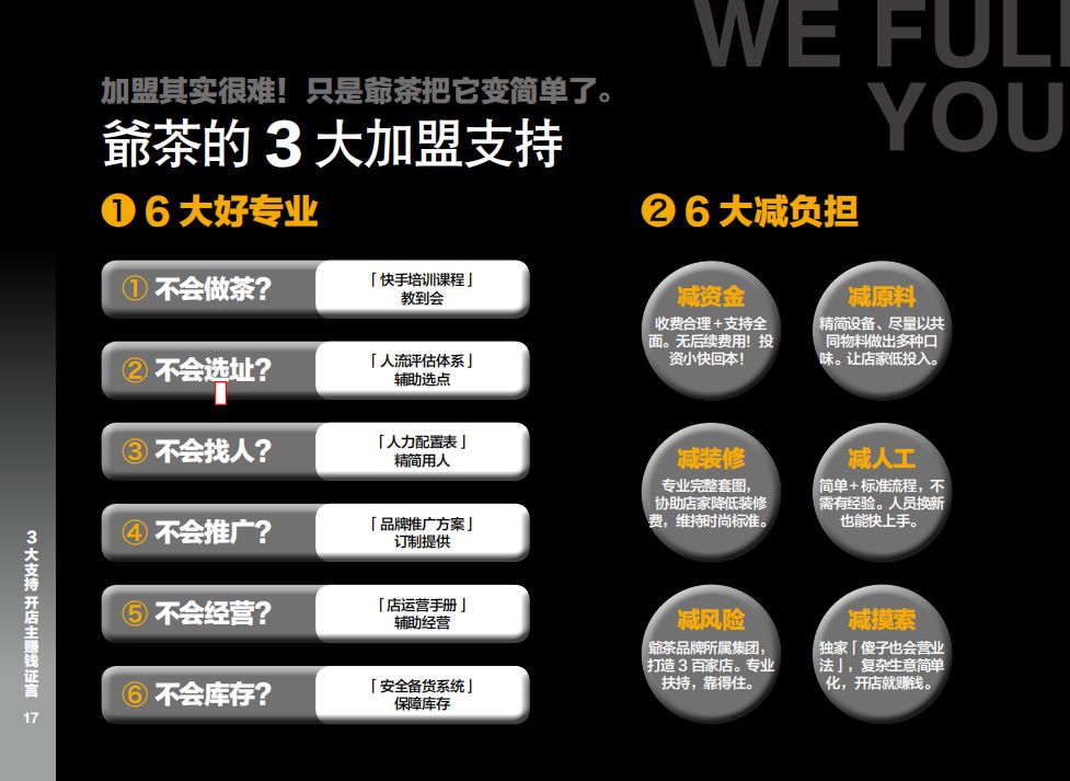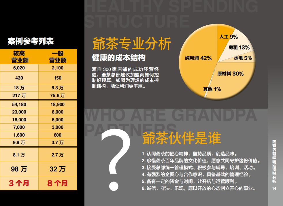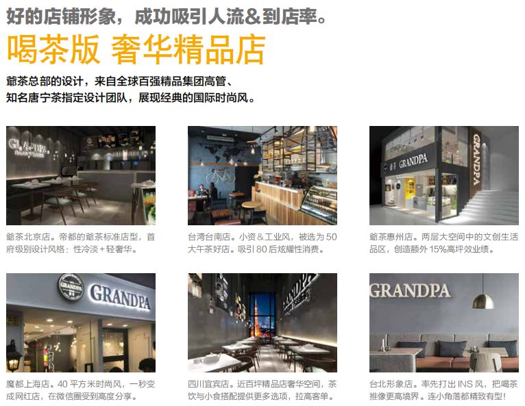 爺茶隶属于伟霸餐饮管理公司(台湾爱美康公司/WT控股集团)具有:1.品牌高端化、2.定位亲民化、3.店业绩扩大化的专业经营能力。旗下的台湾经典代表奶茶品牌:爺茶,4年近400店,以高端前卫的理念与形象,走在趋势前面,诚信稳步与店家携手成长。两岸&海外近10年的经营,首重信誉;让爺茶的加盟店能有超越奶茶业界的高存活率。