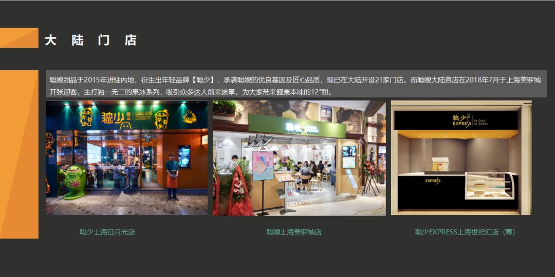 每天大排长龙的“聪嫂甜品”将它的升级品牌“聪少甜品”带着“聪嫂”系列明星产品正式入驻大陆,上海聪少私房甜品有限公司源于母公司“聪嫂”,自2005年诞生在香港,至今已有14年历史。公司于2015年7月进驻中国内地发展,依托众美联 — 中国最具专业规模的餐饮酒店产业链资源整合平台的优势和资源,解决食材原料、中央集中生产,以及供应链系统等支持下的标准化、系统化运作。
