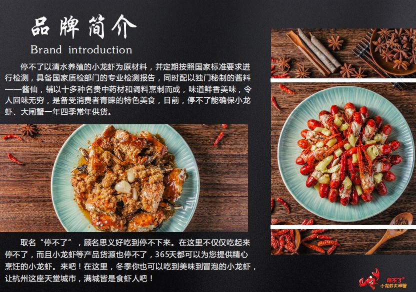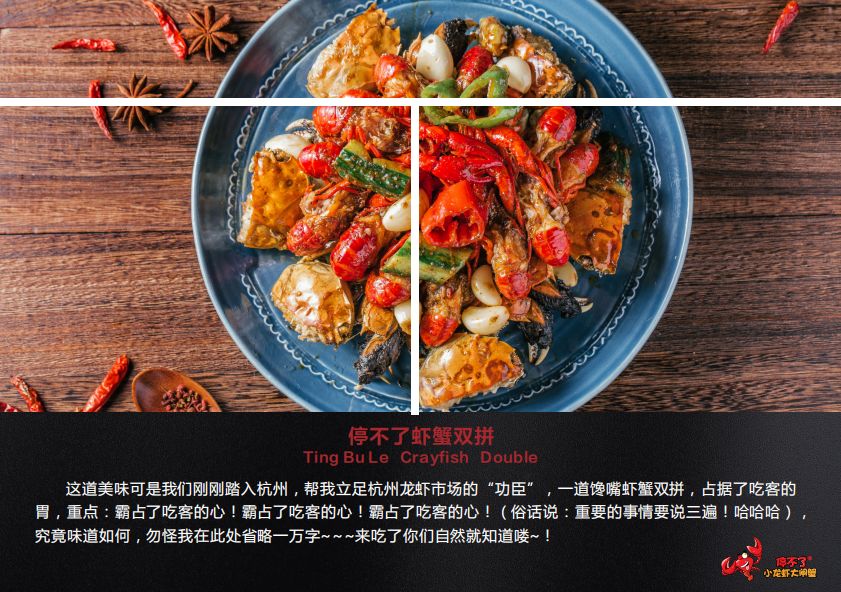 CHINA FOOD 推荐品牌停不了成立于2012年,以专业烹饪虾、蟹、蛙闻名的特色餐饮店,也是杭州目前最受欢迎的餐饮品牌之一来自