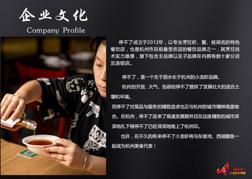 停不了成立于2012年,以专业烹饪虾、蟹、蛙闻名的特色餐饮店,也是杭州目前最受欢迎的餐饮品牌之一
