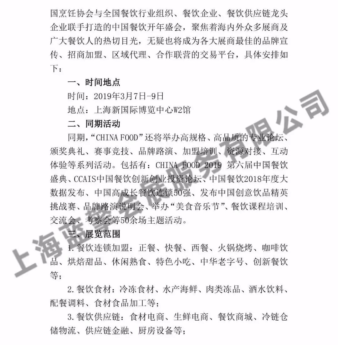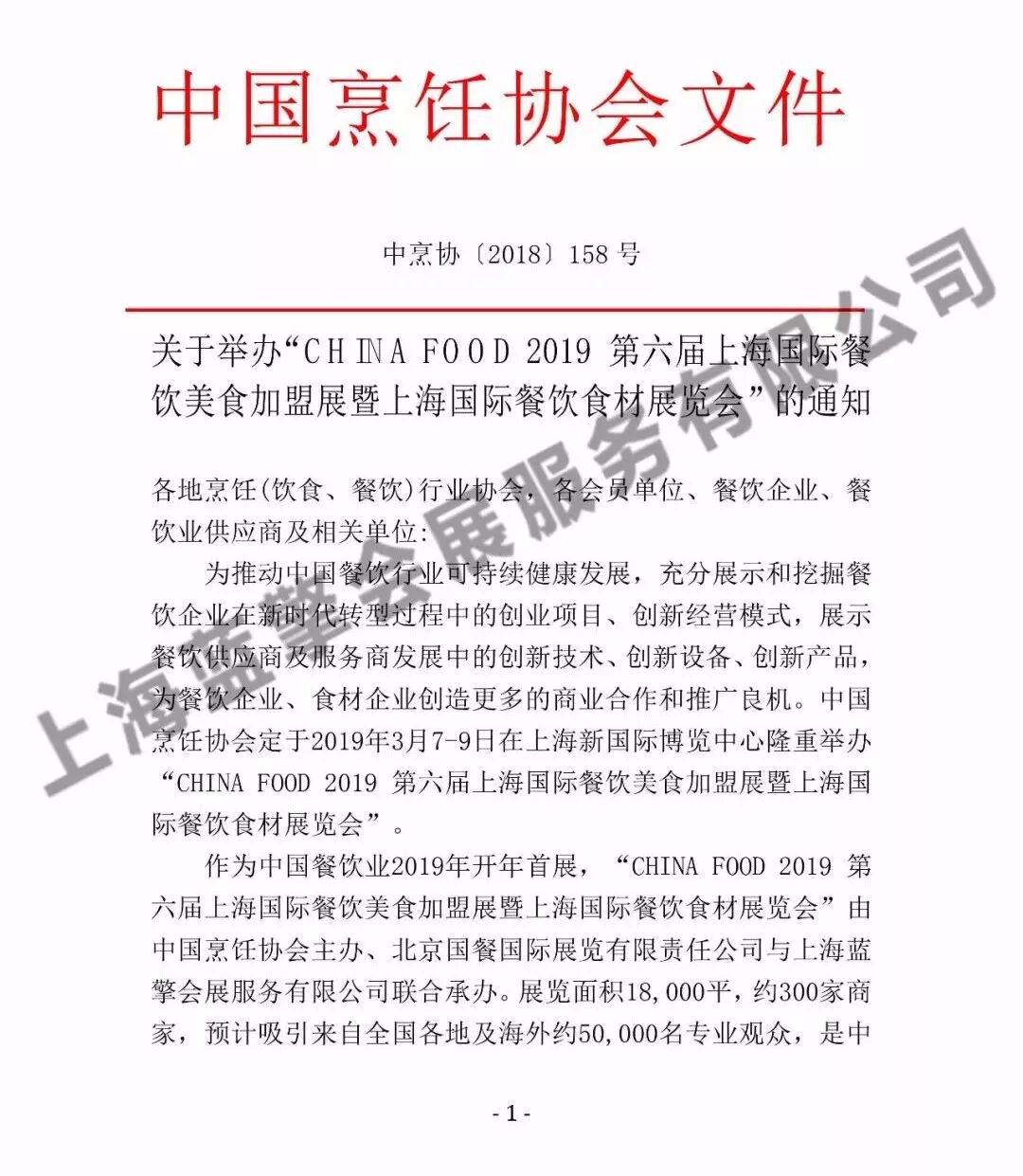 2018年10月16日,中国烹饪协会【2018】158号,下发《通知》,邀请各省、自治区、直辖市及各地烹饪(饮食、餐饮)行业协会,中央国家机关烹饪协会,各会员单位、餐饮企业、餐饮业供应商及相关单位积极参与于2019年3月7日~3月9日,在上海新国际博览中心举办的“CHINA FOOD 2019第六届上海国际餐饮美食加盟展览会”。
