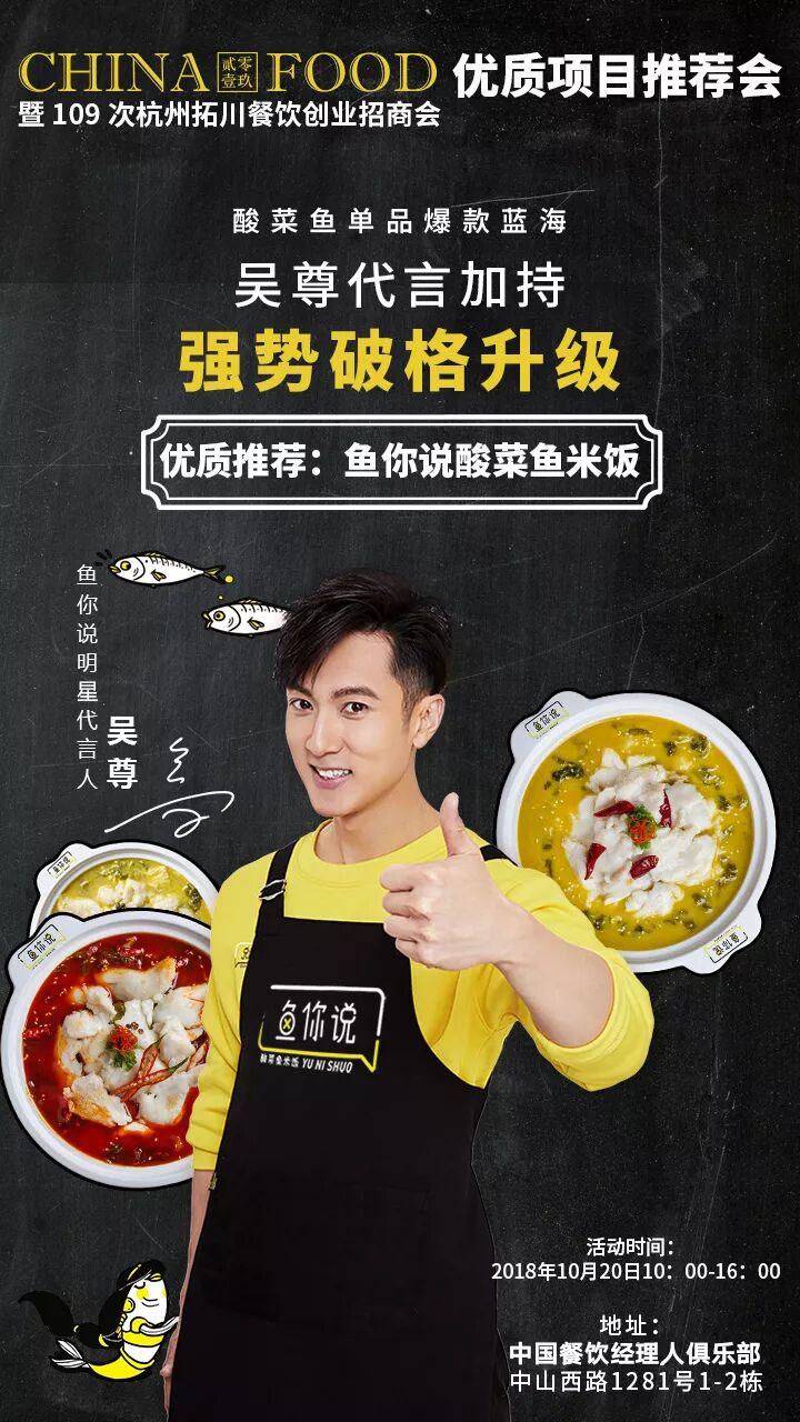 鱼你说酸菜鱼米饭,拓川商盟旗下一个主打快餐式的酸菜鱼米饭明星代言连锁品牌。《2017年轻食客餐饮潮流报告》数据显示,在餐饮菜品销售中,酸菜鱼夺冠,成为最受欢迎的“国民菜”。口感好、受众广的酸菜鱼成为餐饮业的新风口,吸引了众多餐创人士的目光。