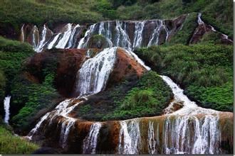 金瓜石距九份不远,是台湾盛产金矿的地方,但在日据时代,被日本人开矿开采,据说金矿所剩无几,目前已封矿停采。但当时开采盛况所遗留下来的建筑及设备,颇具可看性,尤其是黄金博物馆内一块重达201kg的大黄金,据说摸摸这个大金块可以赚大钱。因山势陡峭及山体内富含矿脉,使流经的河水含金量可观,导致沿溪的石头及溪水入海口都呈现美丽的金黄色,堪称奇景。