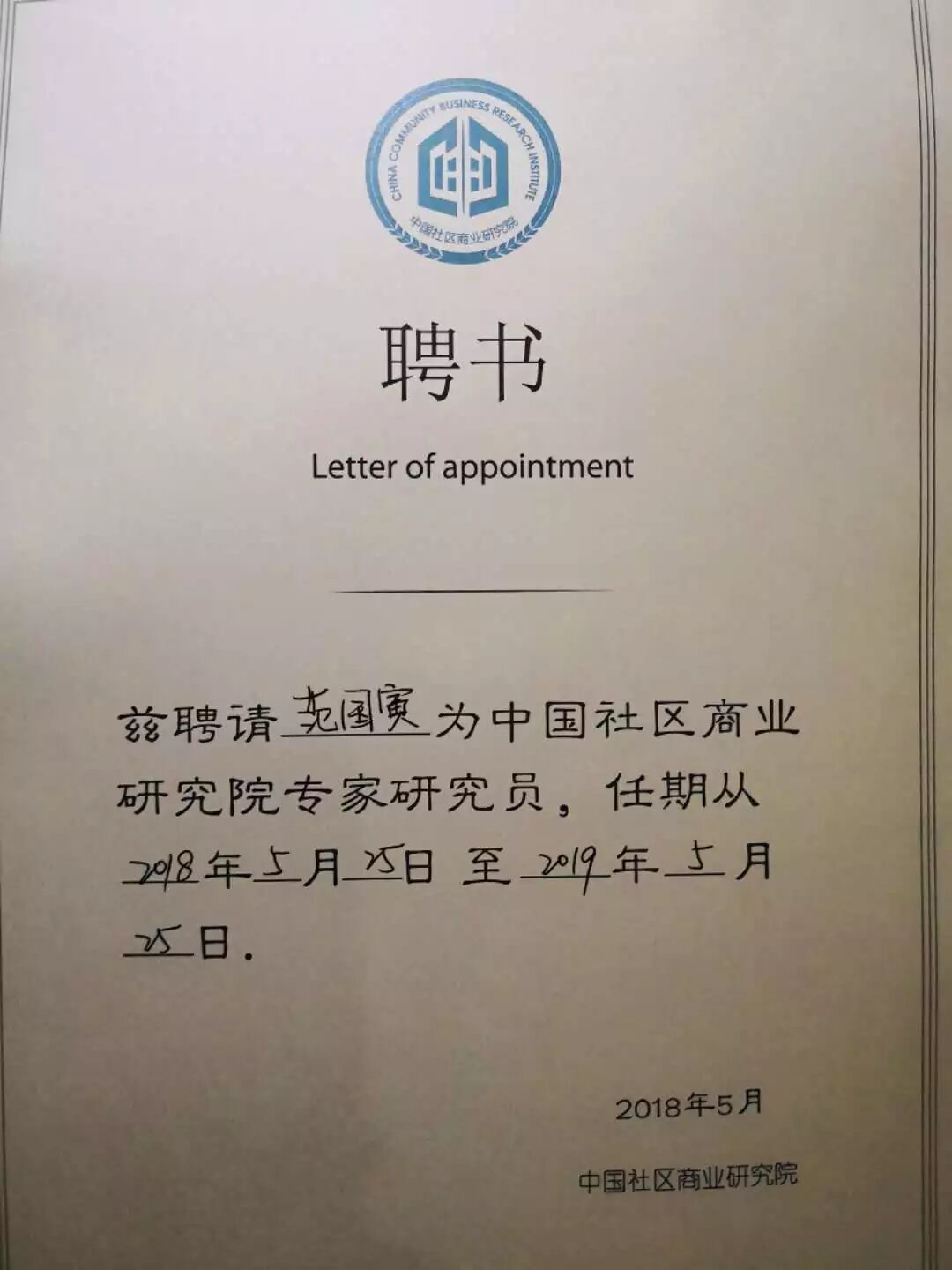 中国社区商业研究院授予专家研究员