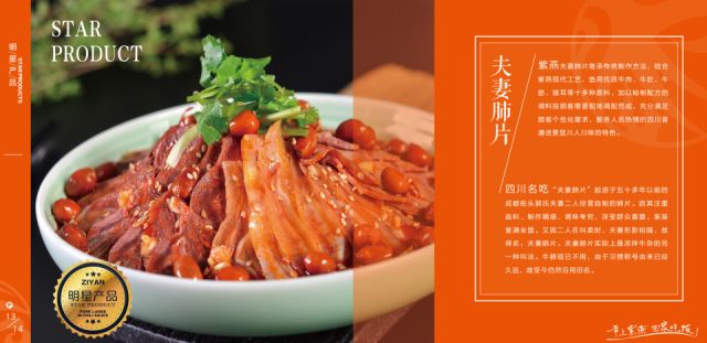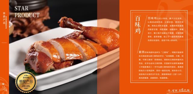 紫燕在全国发展的过程中,一路吸取各地经典菜肴之精华,揉合川/粤/湘菜众味之长,以优选的原料、特制的配方、严谨的工艺,创出以百味鸡、夫妻肺片、藤椒鸡、紫燕鸭(鹅)为主的三十多个精品菜肴,因此所到之处很快成为当地家喻户晓的名吃,成为全国超30万个家庭的美味信赖之选。