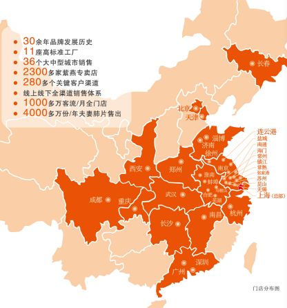 经两代紫燕人的努力,专卖店已覆盖上海、北京、广州、深圳、成都、天津、重庆、南京、武汉、济南、合肥、苏州、长沙、郑州、西安、南昌、杭州、徐州、镇江、马鞍山、芜湖、南通、昆山、淄博、海门、连云港、常熟、盐城、蚌埠、淮南等全国三十多个大中城市,全国已建成十多个高标准区域中心工厂,并与永辉、苏果、欧尚、华联等商超联手创建店中店,实现线上线下全渠道销售。
