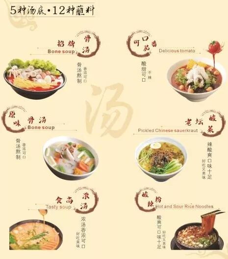 口味创新,坚持每天新鲜熬制大骨汤底,首倡5种汤底高端捞烫:原味骨汤,招牌骨汤(川味),食尚浓汤,可口番茄,老坛酸菜