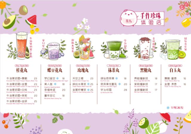 茶丸之所以成为行业里的一匹黑马,茶丸手作的五彩珍珠丸也是独树一帜。传统意义上的珍珠丸子大部分都是黑色的,然而茶丸的手作珍珠丸有着不同的色彩。茶丸第一采用手工制作,第二利用新鲜的水果及鲜花天然上色,不添加色素,更为天然。产品包括了桂花丸,玫瑰火龙果丸,蝶豆花丸,紫薯芋圆丸,黑糖丸等。茶丸手作珍珠丸口味Q弹,软硬适中,色彩丰富,这是茶丸的魅力之一。