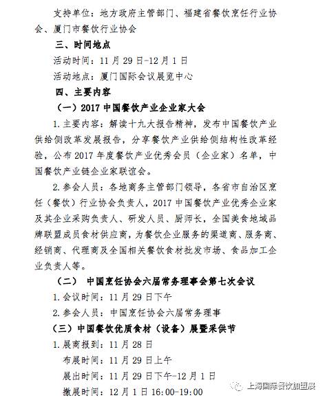 大会时间:2017年11月29日~12月1日大会地点:厦门国际会议会展中心主办单位:中国烹饪协会协办单位:上海蓝擎会展服务有限公司