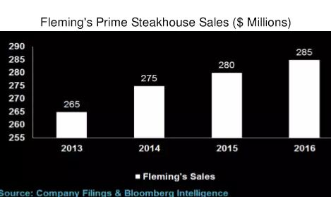 Bloomin'应该剥离连锁业务,集中目标,改进其它餐饮品牌的业绩。Carrabba的同店销售额(same-store sales)2014年落后系统300个基点,Bonefish 2015年落后380个基点,由此可以看出4个连锁品牌管理不善。Fleming's的牛排餐厅可能最适合出售,因为其它业务全是休闲餐饮。按照过去12个月(4月之前的12个月)销售额2.85亿美元、Ebitda率16%、8倍标准计算(最近的收购处在8-10倍范围),出售也许可以获得3.65亿美元。