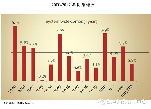 2000-2013年门店的同店增长率为4.5%(低于Chipotle的5.6%)