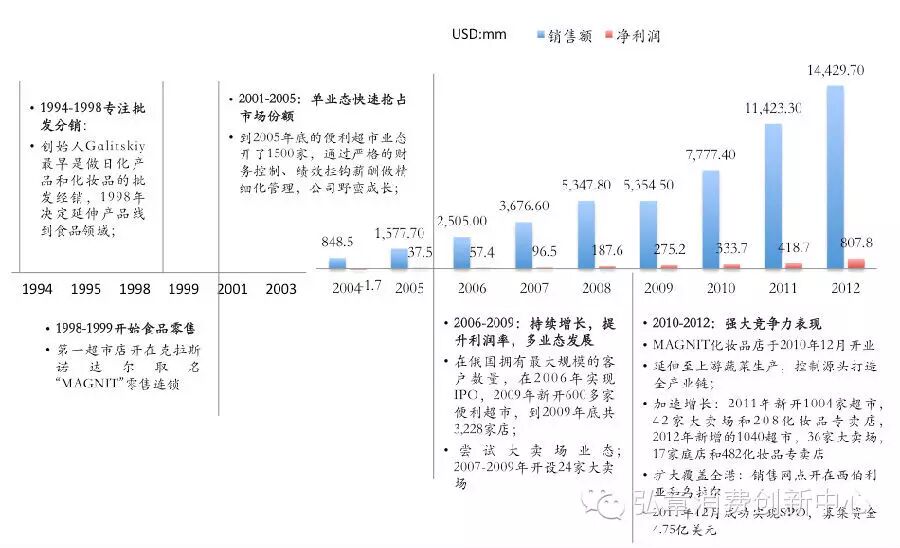财务数据:Magnit2004年销售额8.4亿美元,到2012年达到144亿美元,净利润从-170万美元到8亿美元;净利率达到5.6%;