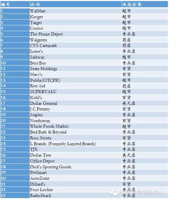 本次研究所选择的公司样本是基于National Retail Federation的《TOP 100RETAILERS (2013)》,我们排除了其中没有公开资料的非上市公司,并选取了最为典型的,且对国内有借鉴意义的几大业态:超市、药店、专业店、百货、美元店等,最终形成33个零售公司的研究样本。