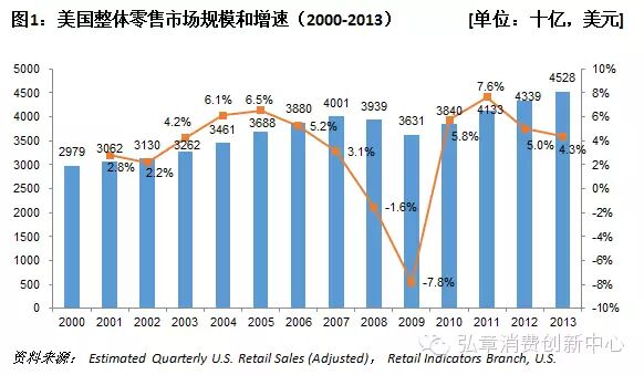 2013年美国零售市场整体规模约为4.5万亿美元,较2012年同比增长4.3%,增速略有下降