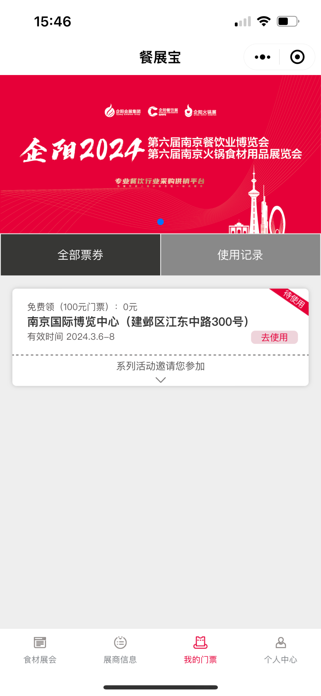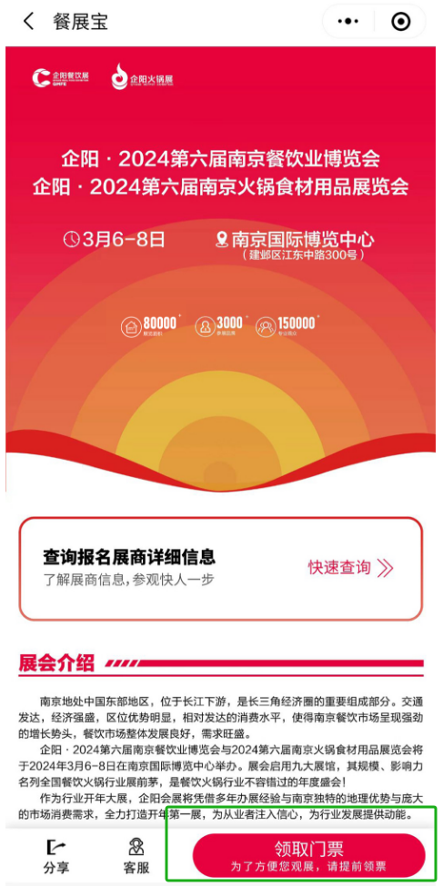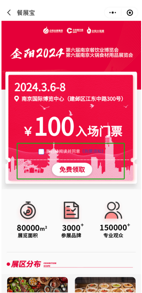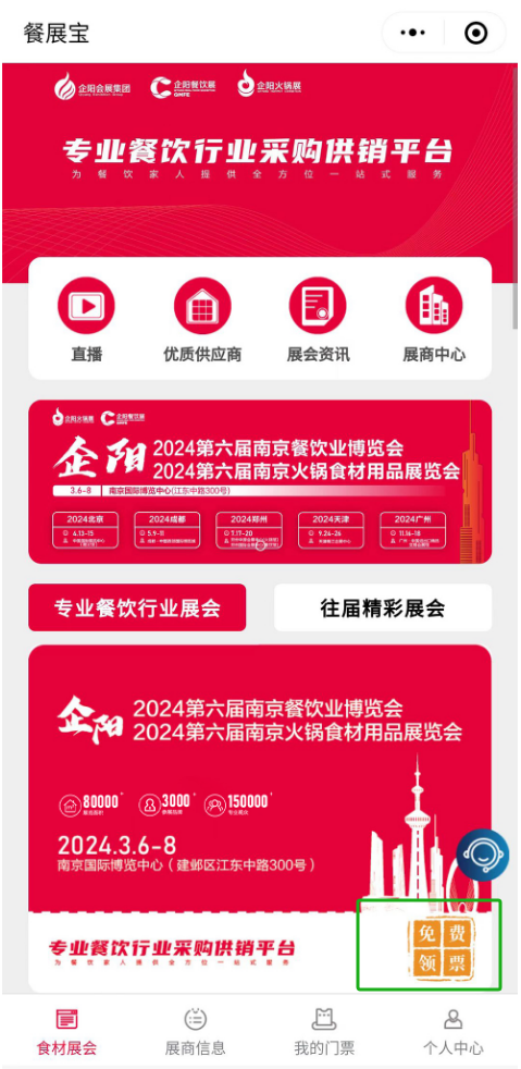 微信打开小程序“餐展宝”,在“食材展会”页面“专业餐饮行业展会”,找到“2024第六届南京展免费领票”点击授权进入。