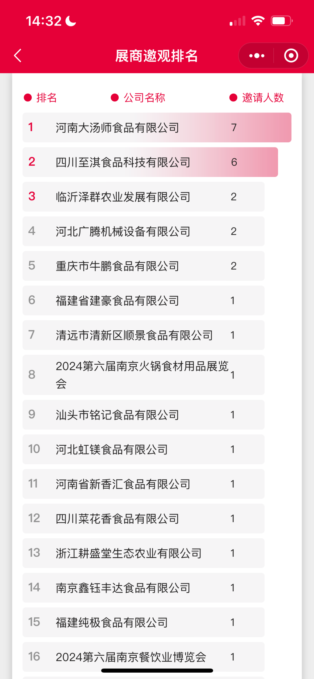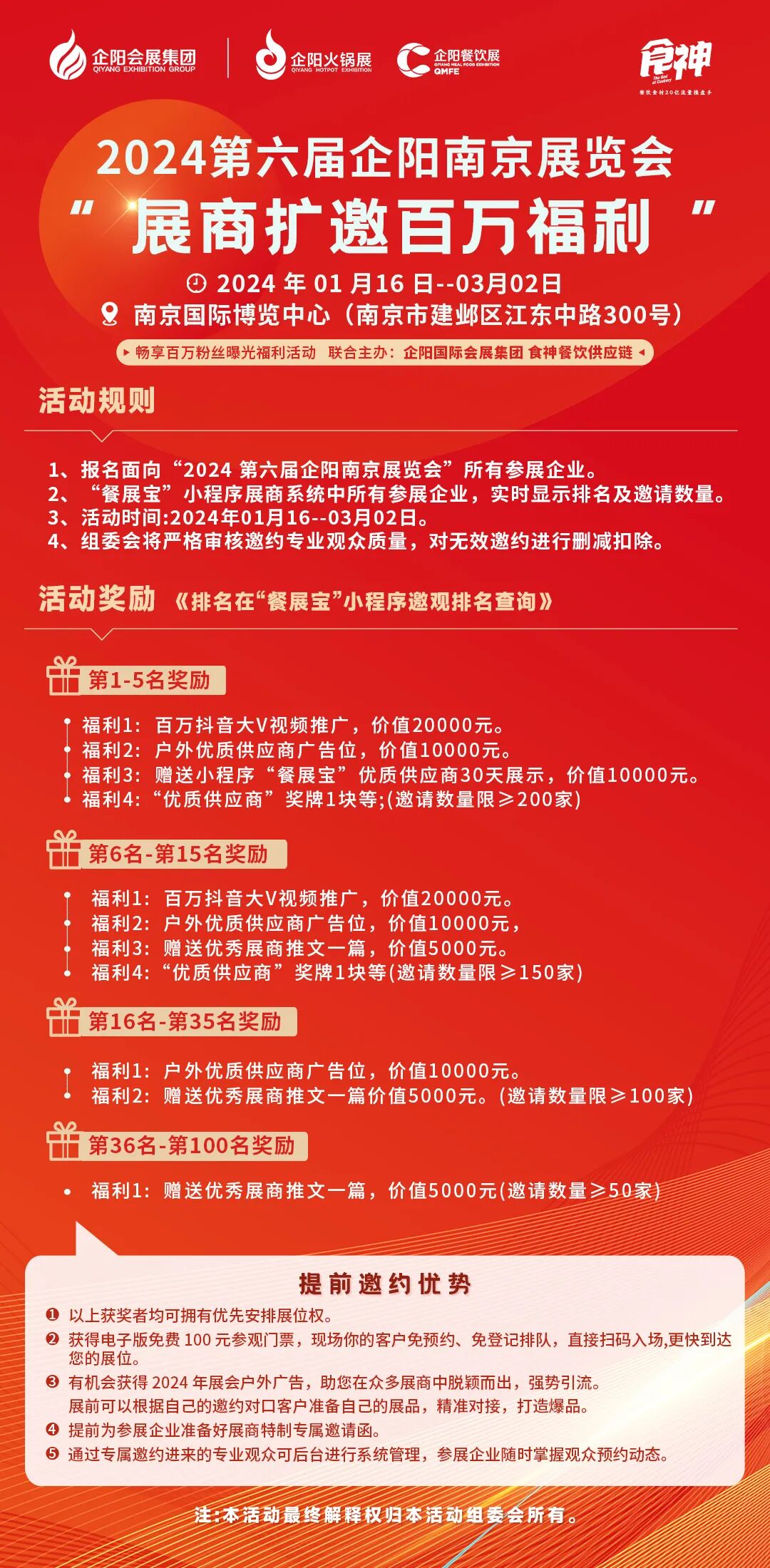 方式内容:参展商在微信小程序餐展宝生成专属邀请函(含邀约二维码),邀请意向客户或专业观众参观3月6-8日在南京国际博览中心举办的企阳2024南京展。活动时间截止时根据餐展宝展商系统实时显示排名及邀请数量,对应名次展商可享受以下不同福利。(具体如下海报)