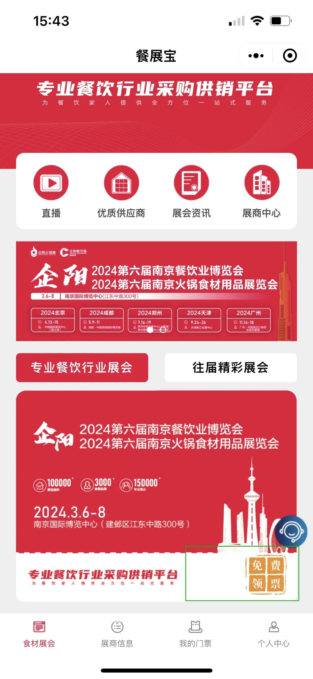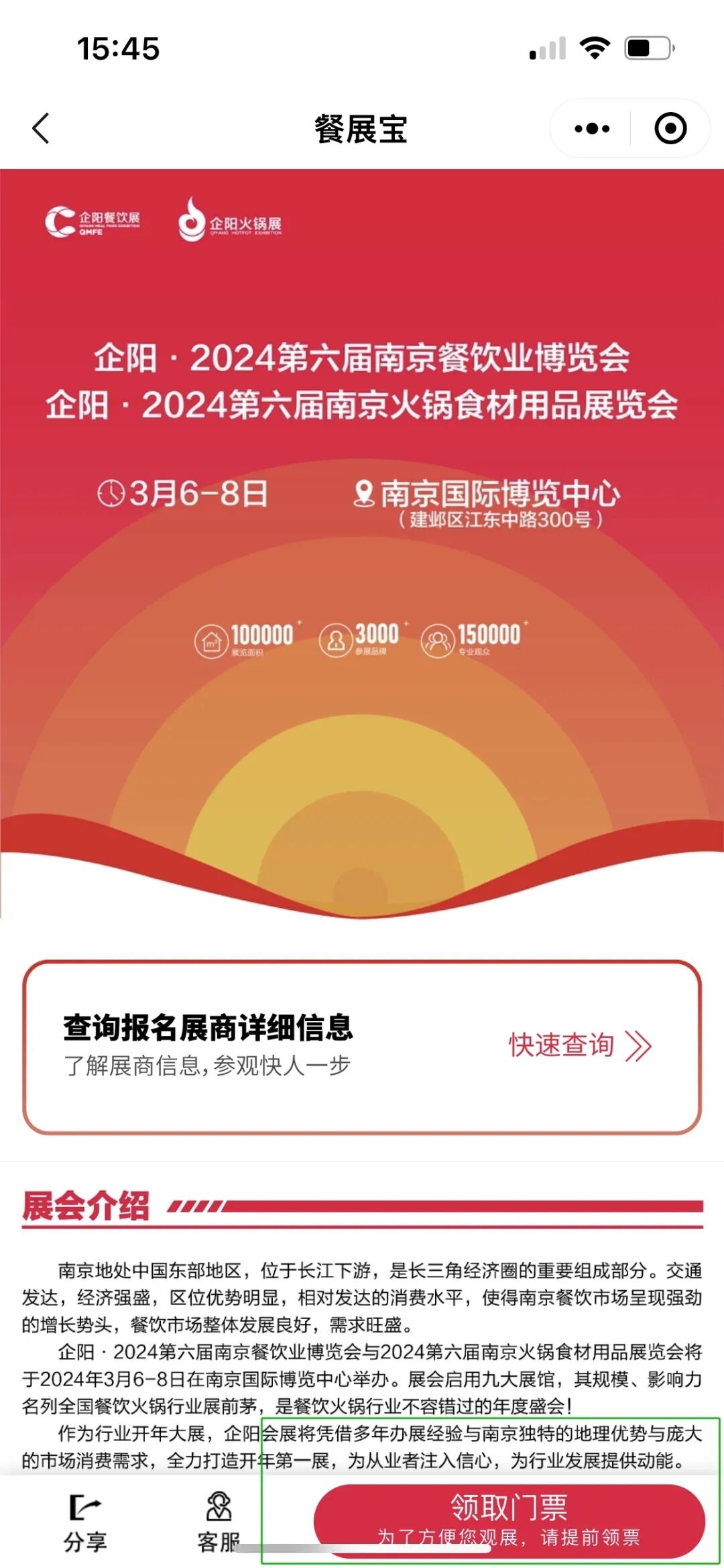 微信打开小程序“餐展宝”,在“食材展会”页面“专业餐饮行业展会”,找到“2024第六届南京展免费领票”点击授权进入。