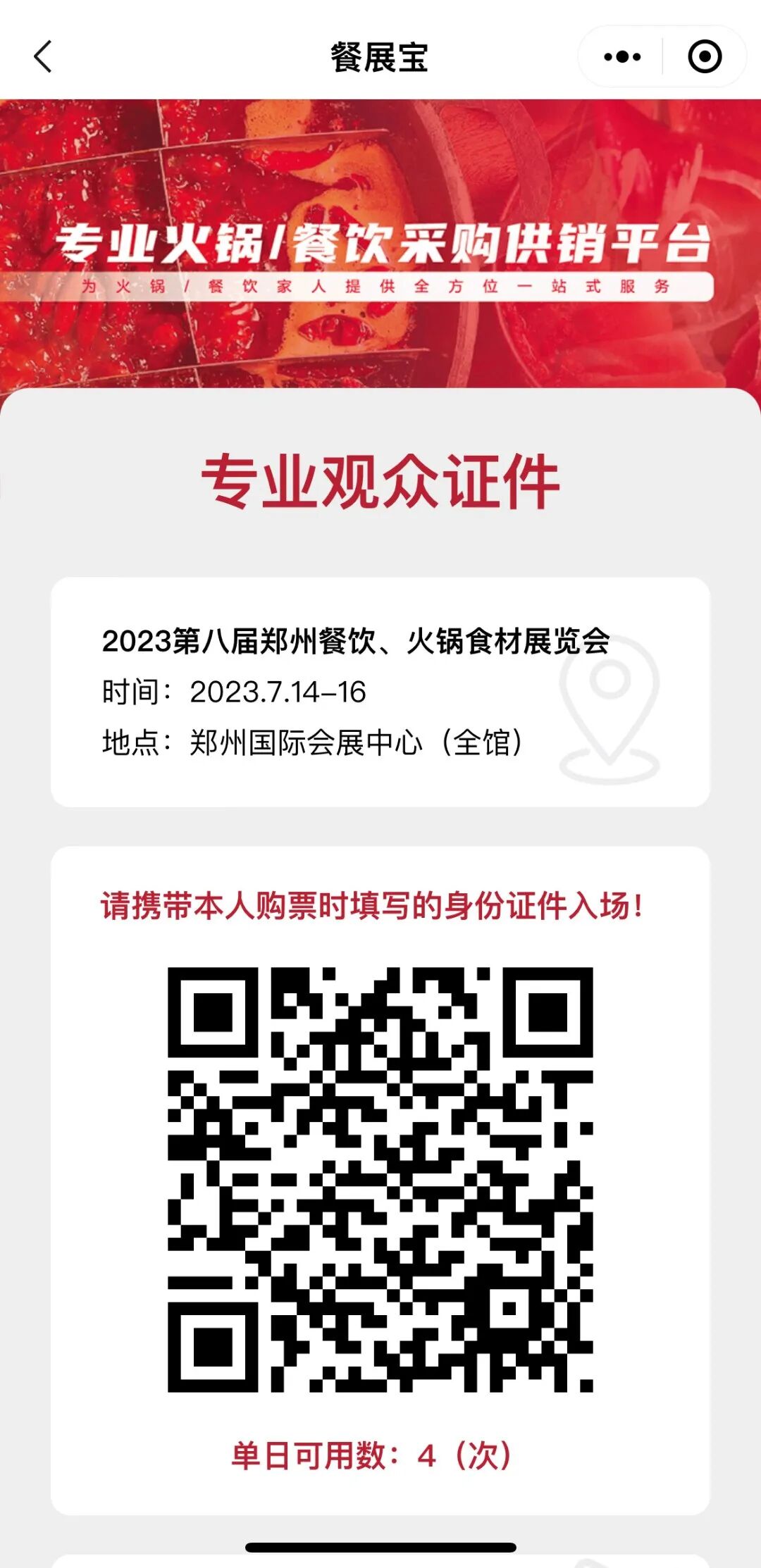 保存成功即可在“我的门票”获得郑州展门票,点击即可看到您的二维码。