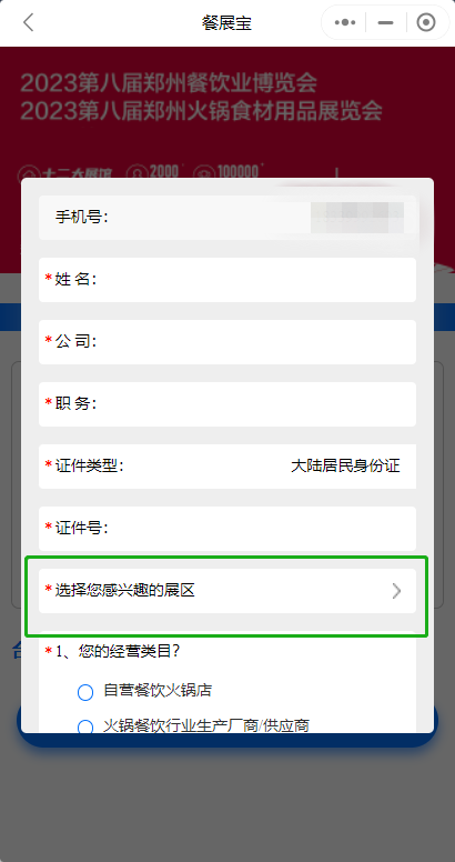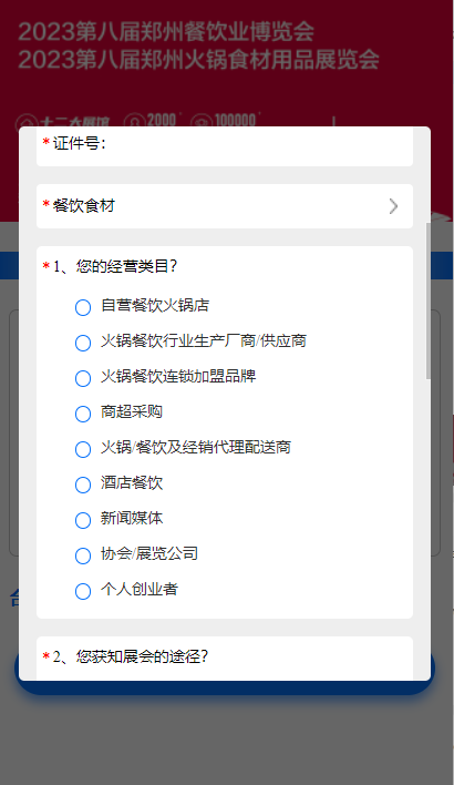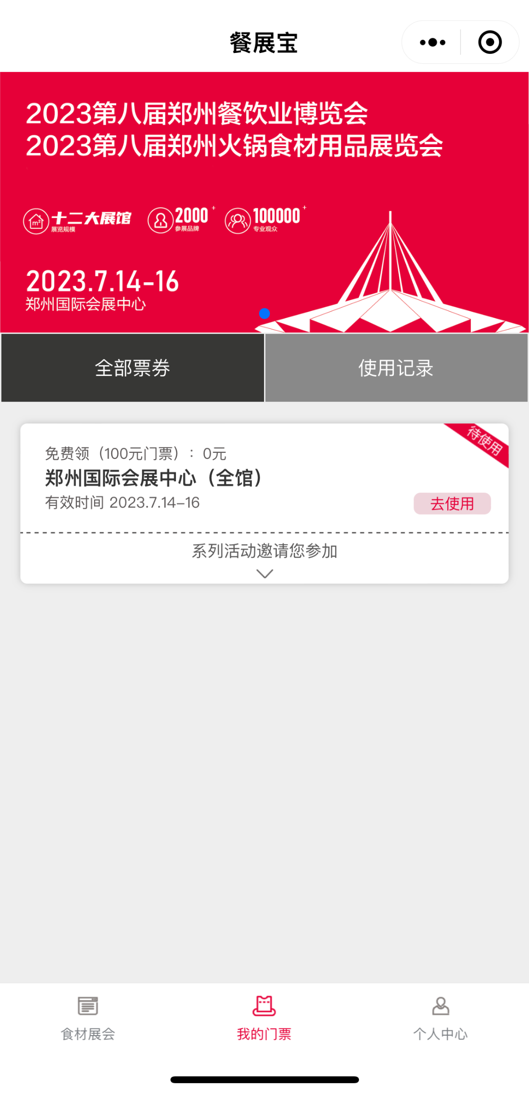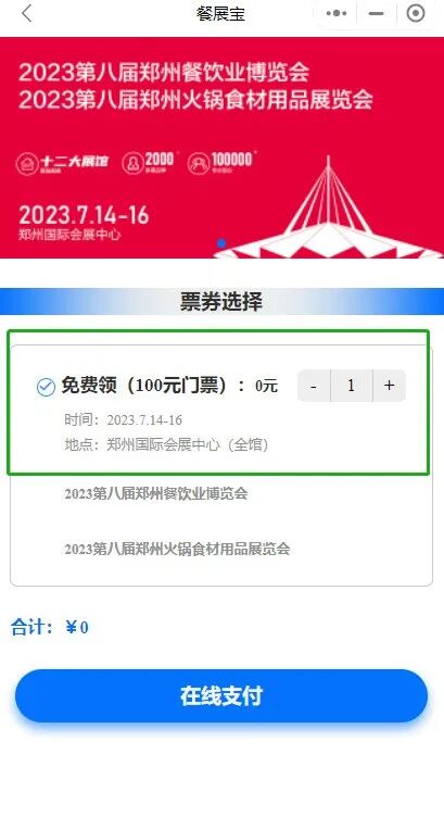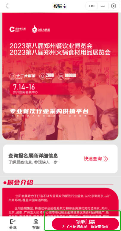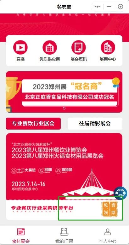 微信搜索小程序“餐展宝”,在“食材展会”页面“专业餐饮行业展会”,找到“2023第八届郑州展免费领票”点击授权进入领票。