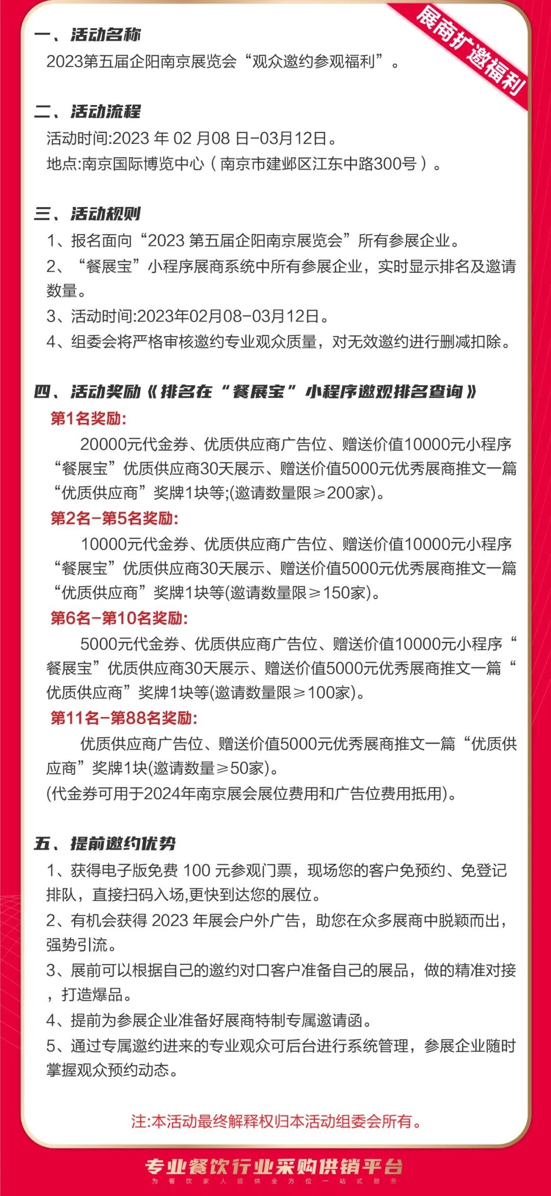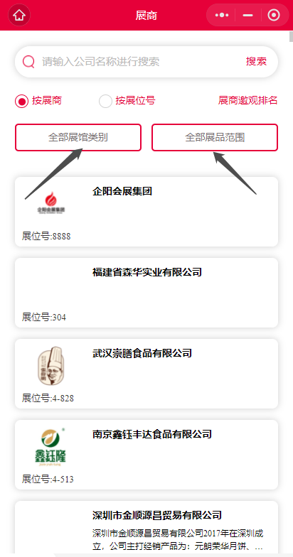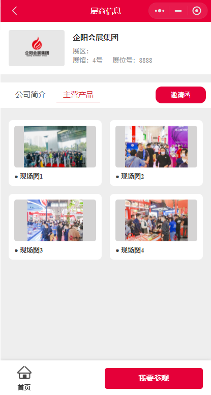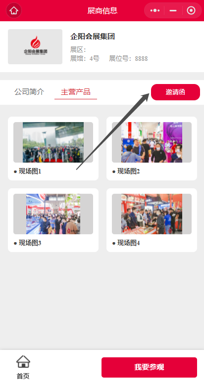 在餐展宝的“展商中心”版块或进入南京展在展会信息页面点击“查询报名展商详细信息”,观众即可按需查询对应展商。观众可以提前在展商查询版块,根据全部展馆类别或者全部展品范围快速查询感兴趣企业并了解企业简介、主营产品、展位号等具体信息,实现精准配对的同时也为您甄选优质合作伙伴。3、展会专属邀请函