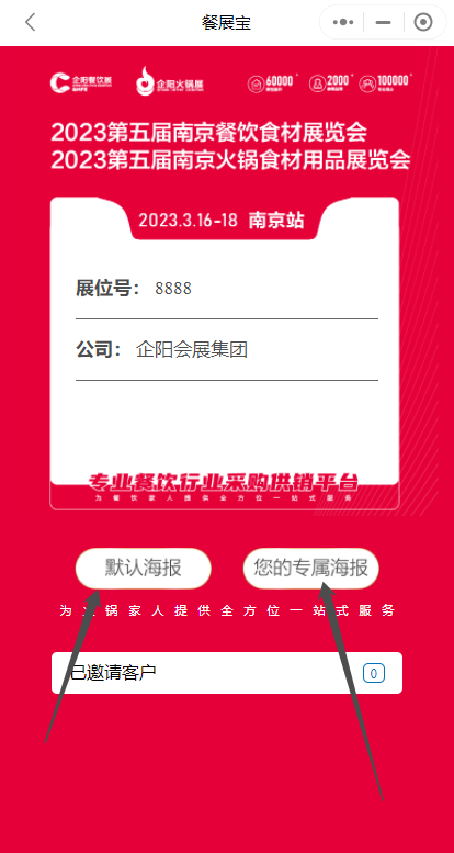 图2展商可在个人“展商信息”页点击“邀请函”,查看已邀请顾客并生成两种邀请海报,如点击默认海报生成图1示例的海报或者点击“您的专属海报”生成图2示例的可自行选择模板上传企业图片的专属海报。4、展商服务