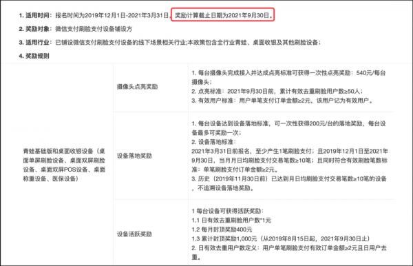 微信刷脸支付设备官方奖励政策截图