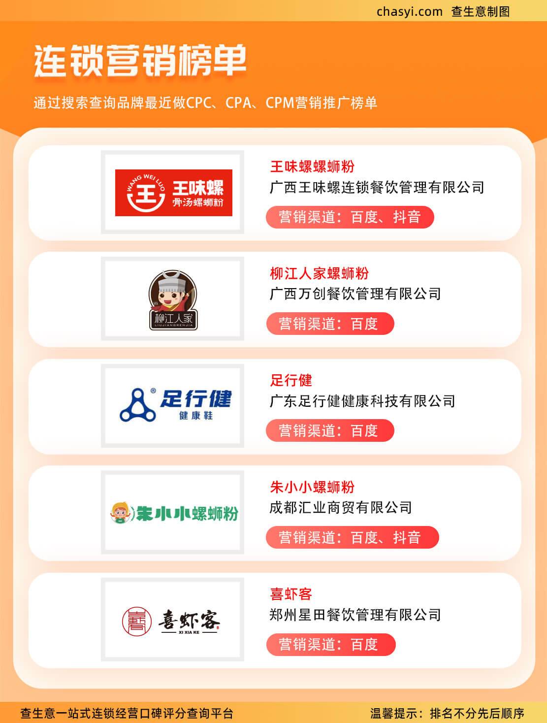 在当下竞争激烈的商业环境中,连锁品牌通过精准有效的营销推广,不仅提升了品牌知名度,还进一步巩固了市场地位。近期,一系列连锁品牌通过CPC(按点击付费)、CPA(按效果付费)、CPM(按展示付费)等多种方式展开营销推广活动,取得了显著成效。其中,王味螺螺蛳粉、柳江人家螺蛳粉、足行健、朱小小螺蛳粉以及喜虾客五大品牌脱颖而出,成为连锁营销榜单的佼佼者。