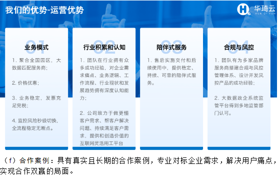 华琦云:数字化交易合规服务平台,致力于打通企业与个人的交易环节,提供完善的涉税服务。通过与税务机关的合作,华琦科技取得了经营资质和委托征收资质,保证了平台的合法性和稳定性。