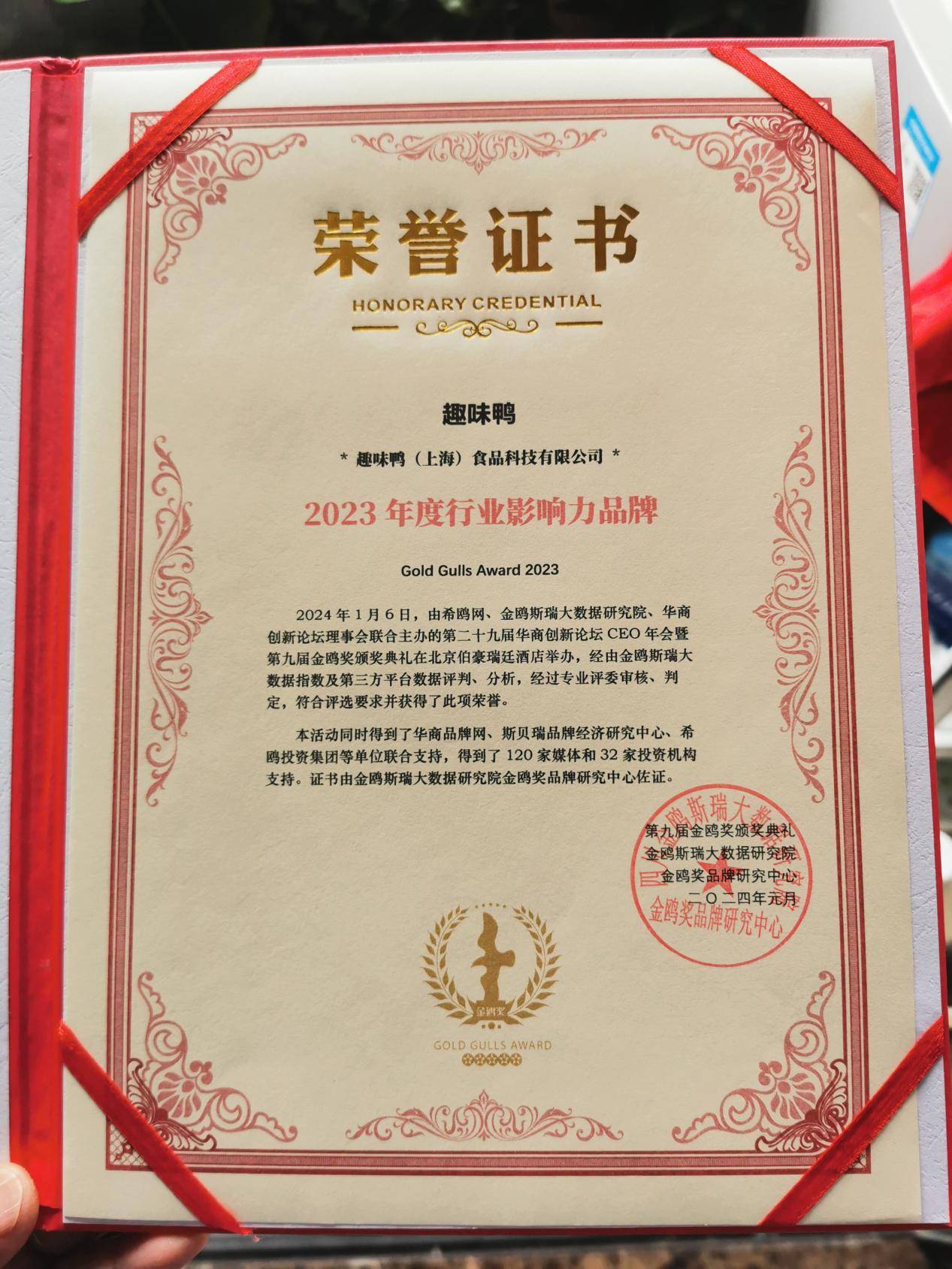 “趣味鸭(上海)食品科技(趣味鸭)”获评2023年度行业影响力品牌奖