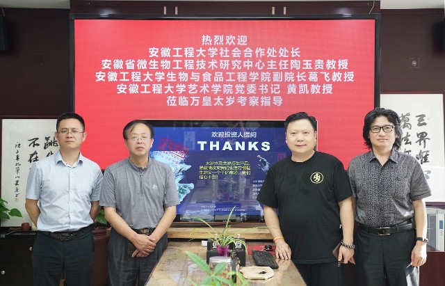 (上图:安徽省微生物工程技术研究中心、安徽工程大学生物与食品工程学院和安徽太岁供应链管理有限公司联合成立太岁生命实验室。安徽省微生物工程技术研究中心主任 陶玉贵教授 左二,安徽工程大学生物与食品工程学院副院长 葛飞教授 左一,安徽工程大学艺术学院党委书记 黄凯教授 右一,安徽太岁供应链管理有限公司创始人 程鱼 右二)