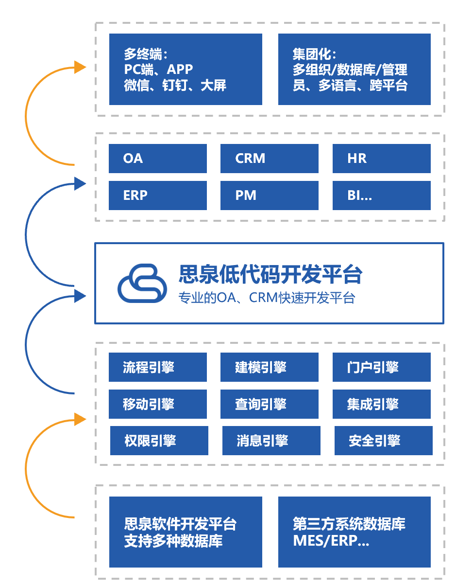 “思泉OA&CRM低代码开发平台”是一个专注提高软件“复用率”的二次开发软件框架,抽象和封装了用户开发一个业务系统所需要的全部功能及众多可调用的微内核,使得用户能够不写代码或少写代码就能开发出完整的系统,能让软件的开发效率提升80%以上。。