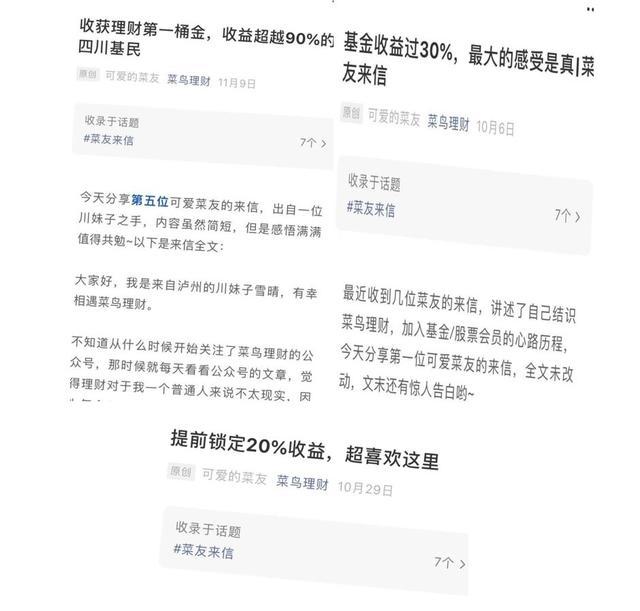 他们的“基金训练营”跟投服务受到广大学员们的热爱。具体说来,菜鸟理财“基金训练营”是为期3个月的陪伴式训练营,主要内容和服务是系统分享基金投资知识和技巧,采用边学边投的方式分享投资方法,帮助用户掌握基金投资正确姿势。这3个月的基金营包括3套课程和1个专栏:分别是入门课、扫盲课、指数基金系列课及跟投基金分析专栏。多位热心学员来信直言:"感受真实,喜欢这里,继续跟投。"