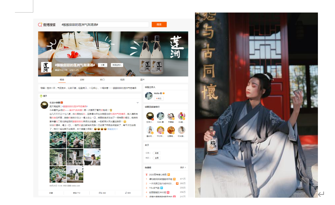 “莲洲”品牌上线初期推广就在微博引起一波热话题,超话达到破千万的阅读量,另外与江湖小粗腿、多多猫DODO等抖音达人主播达成了直播合作,颜值与口感并存,实力与美貌起飞。