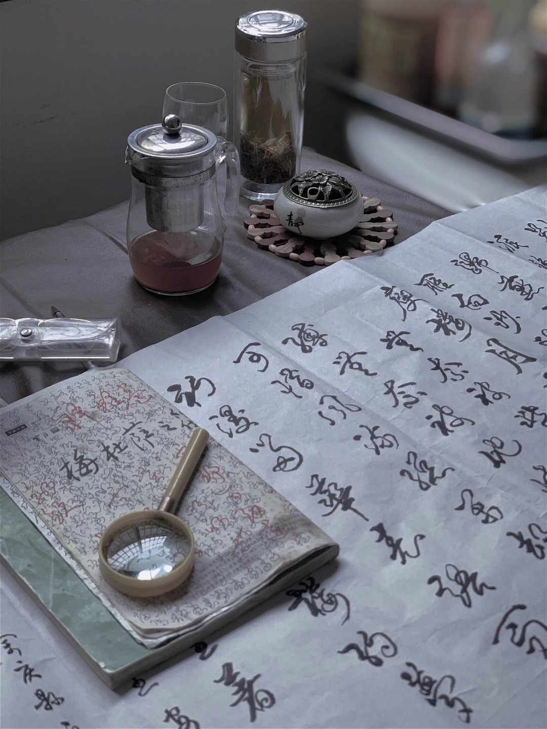 出殡那天,我和妹妹到太公房间收拾遗物。几日来终于平定下来的心绪在走到太公书桌前的那一刻被割裂,被揉碎。桌上还摊着太公的老花镜、刚写好的赋和一壶泡了还没来得及喝上一口的茶。这是太公离开后的第六十七个小时。妹妹说,感觉太公好像还在。