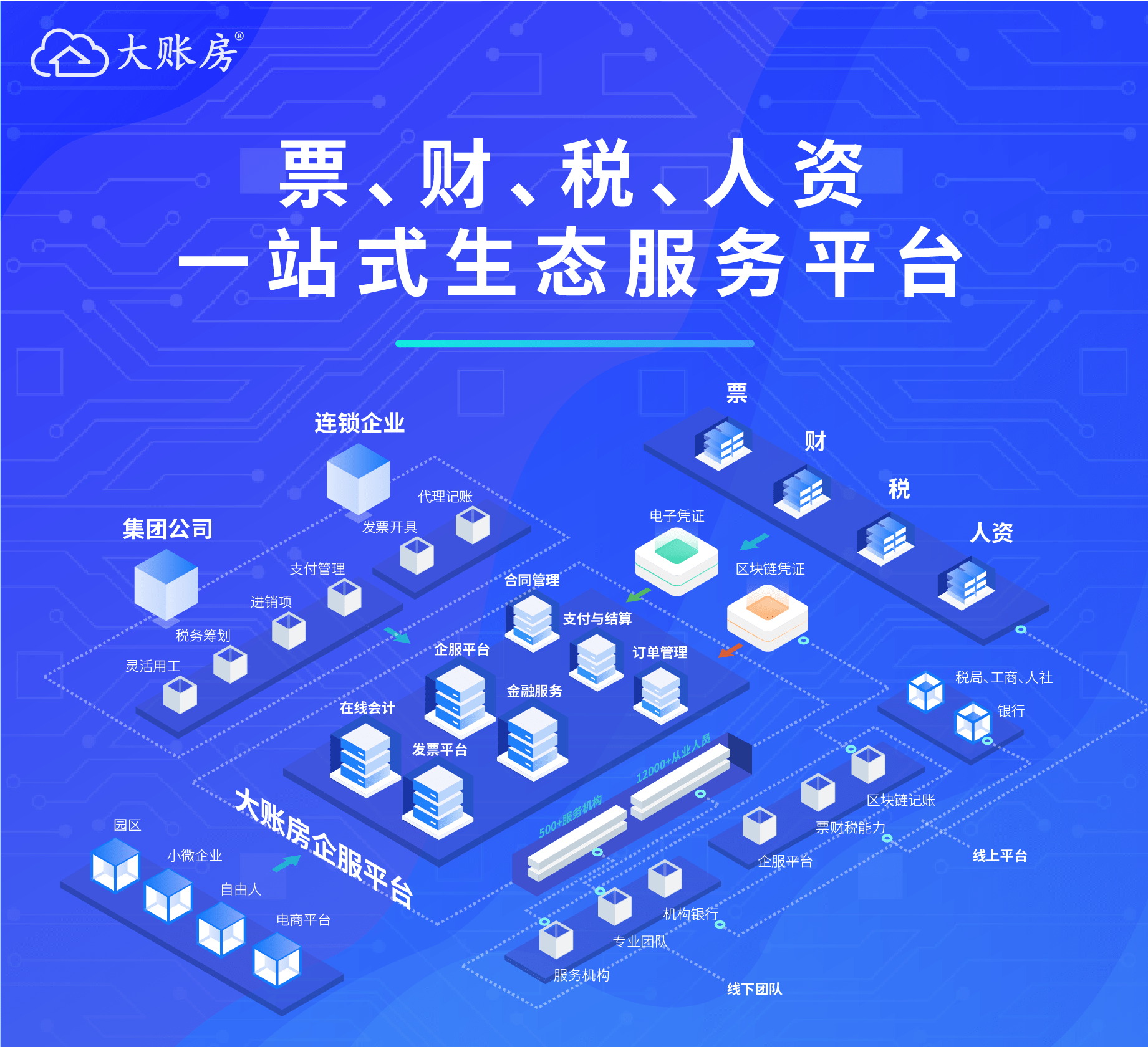 大账房致力于以科技为驱动,打造票、财、税、人资一站式生态服务平台,是国家高新技术企业,拥有100多项软件与专利技术,500多个服务机构,12000多人服务团队,业务覆盖全国400多个城市,东南亚、非洲等地区,为企业提供“票、财、税、人资”一站式解决方案,为小微企业提供服务,也为大中型企业全国布局进行财税人资业务落地。