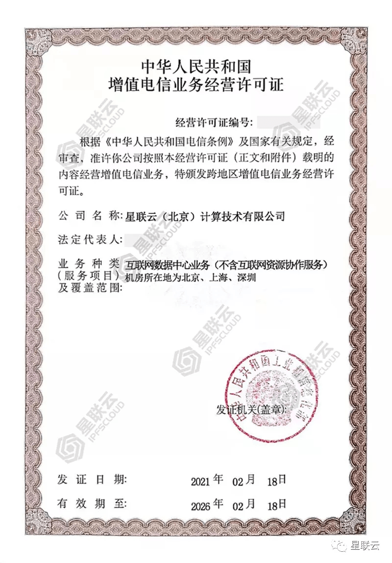 星联云于2021年2月18日获得工业和信息化部颁发的《中华人民共和国增值电信业务经营许可证》,取得互联网数据中心经营资质。