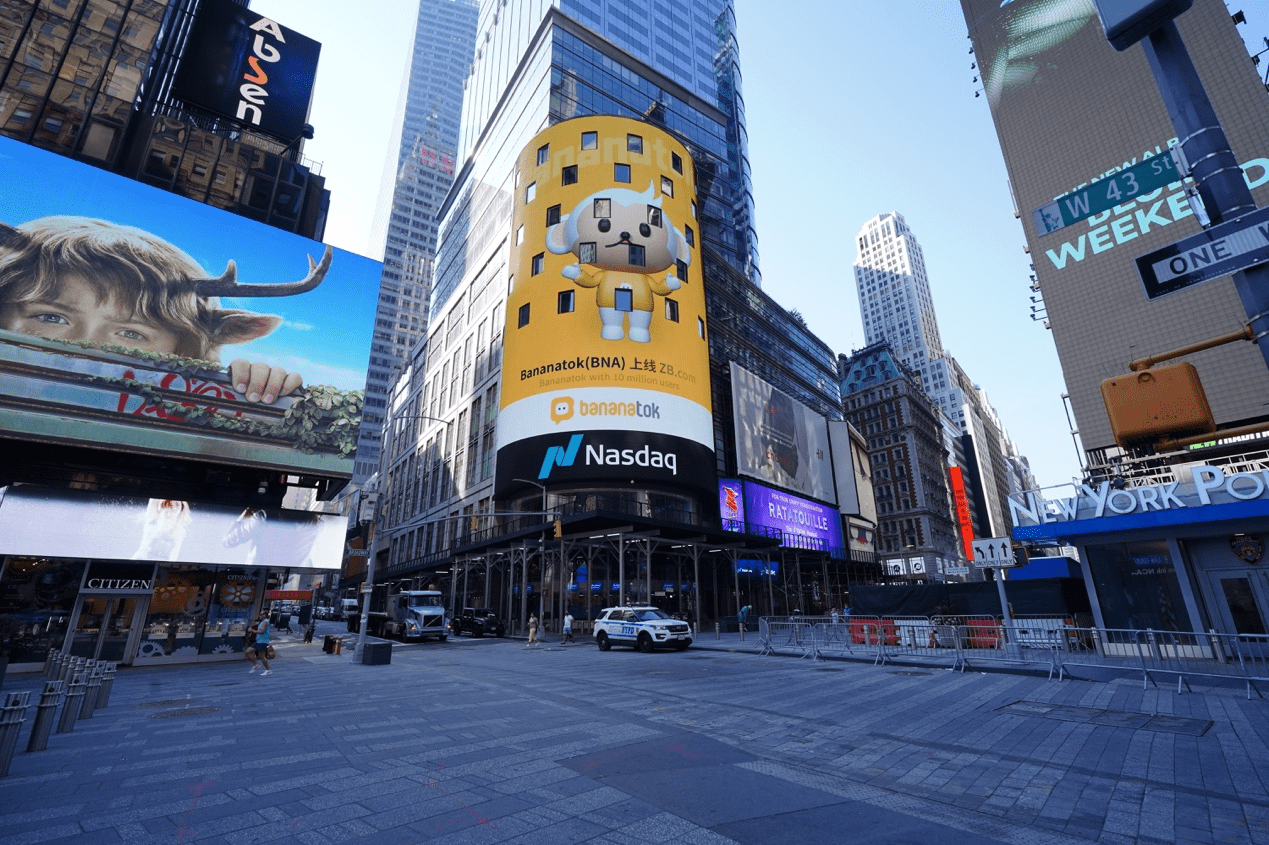 美国纽约时代广场被誉为“世界的十字路口”,每年千万商业精英汇集于此,是全球当之无愧的商业核心地和知名财富地标。其中纳斯达克半圆柱形巨幅屏是最受瞩目的标志性建筑之一,被称为“世界第一屏”,历来都是世界顶级优秀公司的秀场。近些年来,世界诸多优秀公司或项目开始受邀登上纳斯达克巨幅屏,向世人彰显其品牌实力,BNA(Bananatok)也很荣幸能够登陆象征品牌实力的纳斯达克巨屏,并希望以此为开端,从这里把优秀的项目传递给世界,正式迈入全球生态的扩张阶段。