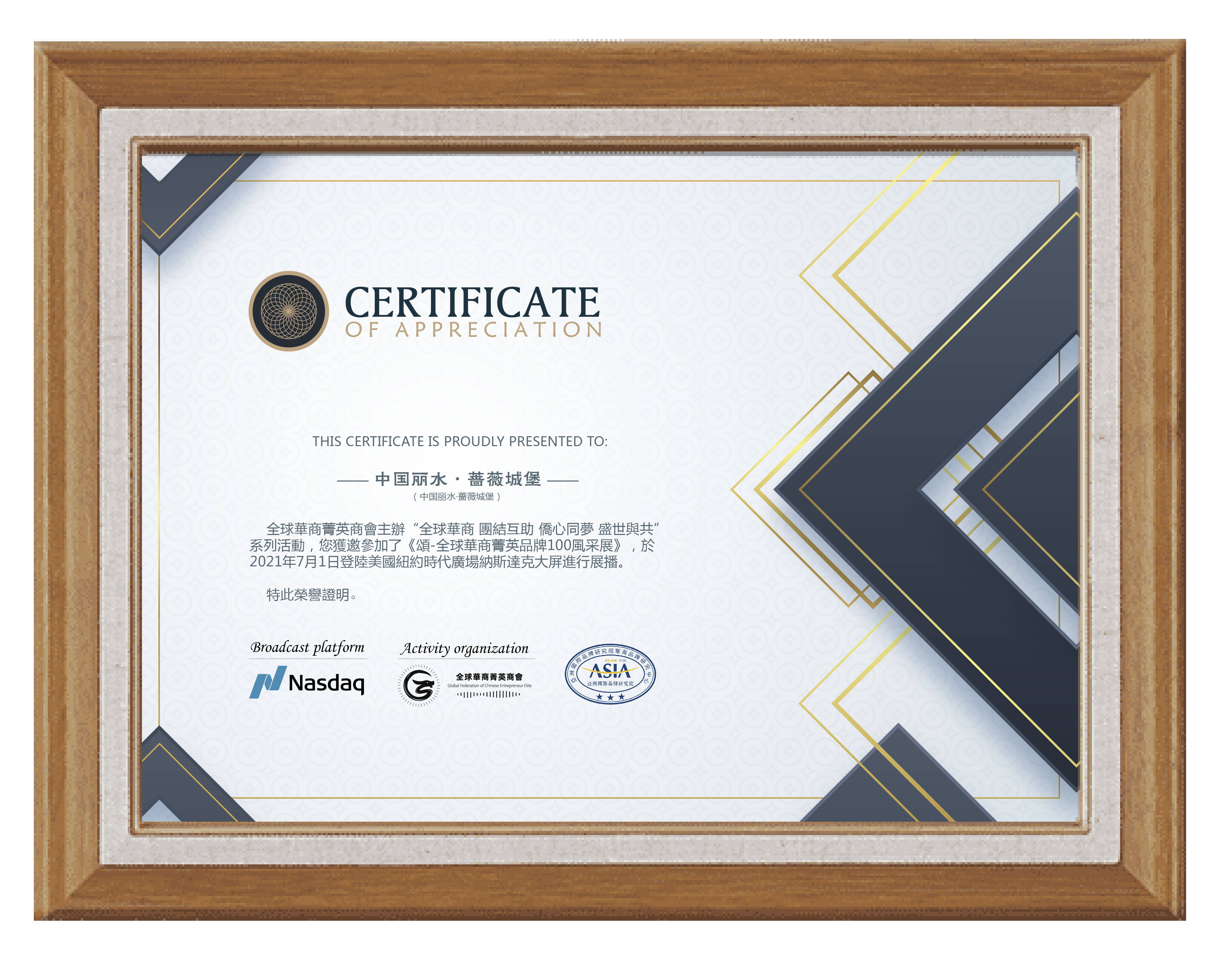 2021年7月1日,作为华商群体创新创业的杰出代表,浙江丽水蔷薇城堡创始人田景海先生入围并受邀参加纳斯达克大屏“全球华商菁英100人”主题展活动。