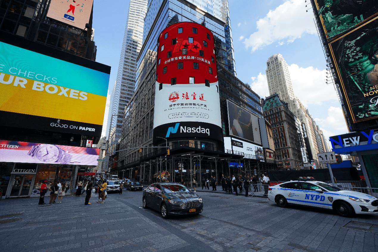 登陆纳斯达克大屏,向世界传递华商品牌风采。纳斯达克(NASDAQ)大屏是纽约市中心——“世界的十字路口”纽约时代广场的标志性建筑,以面积之大、世界影响之广成为全球各领域领先企业争相亮相的瞩目焦点,成为洞悉世界经济的风向标——京东、拼多多、新浪、搜狐、网易、百度、携程等百余家华商菁英企业在纳斯达克敲钟上市。
