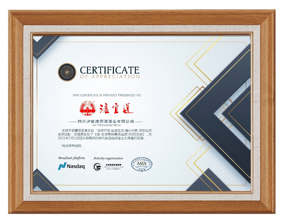 2021年7月1日,作为华商群体创新创业的杰出代表,四川泸宜遵原酒酒业有限公司(下称“泸宜遵”)入围并受邀参加纳斯达克大屏“全球华商菁英品牌100风采展”主题展活动。