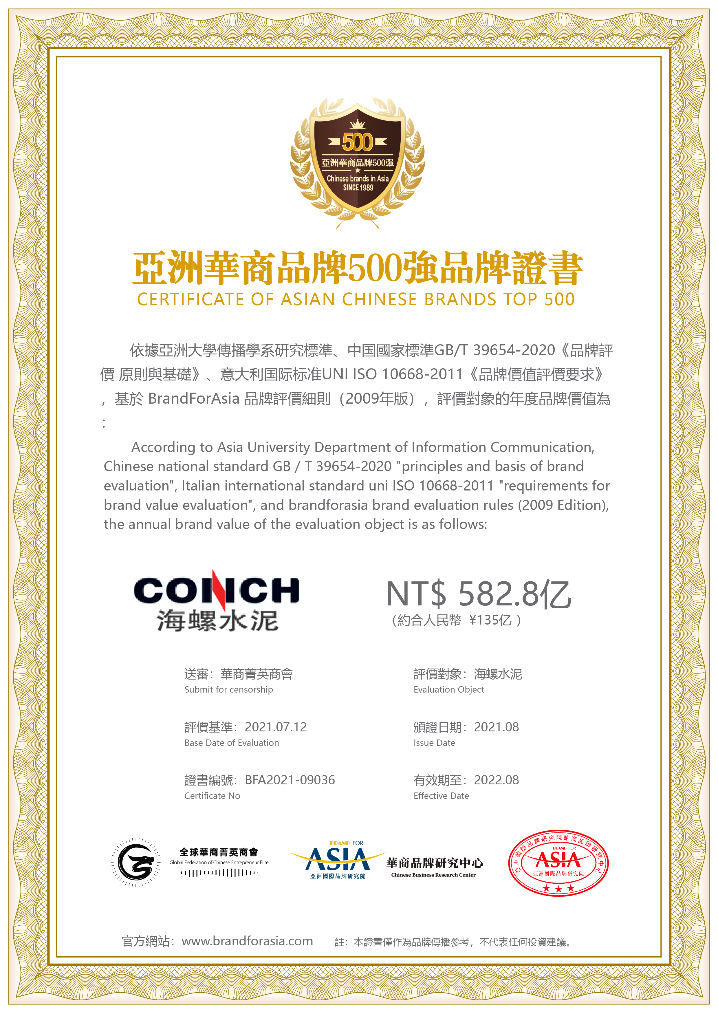 据亚洲国际品牌研究院华商品牌研究中心,海螺水泥入围2021年度亚洲华商品牌500强榜单,品牌价值135亿(约合新台币582.8亿)。