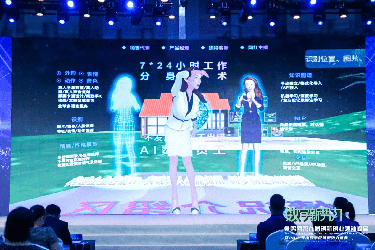 在活动的最后,第九届创新创业领袖峰会年度数字经济新势力品牌及其他系列奖项荣誉揭晓,凭借创新力及在行业内的影响力,北京虚实科技有限公司的AI数字员工游小游作为“数字新势力”的代表登场,做了主题演讲,赢得了与会嘉宾的一致赞叹和高度评价,并荣获“2021年最具创新力项目”奖项。