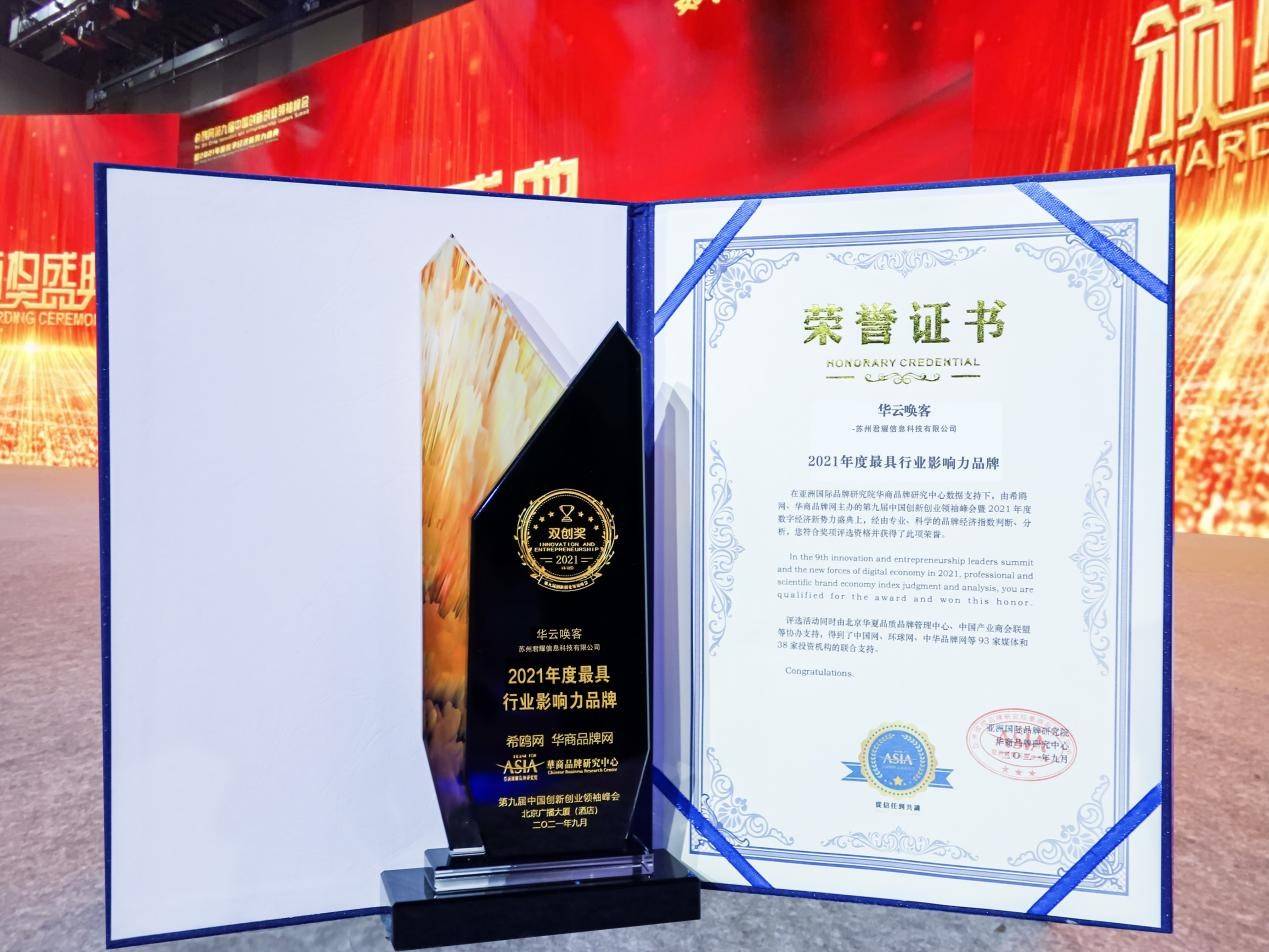 捷报—华云唤客”荣获“2021年度中国最具行业影响力品牌”奖