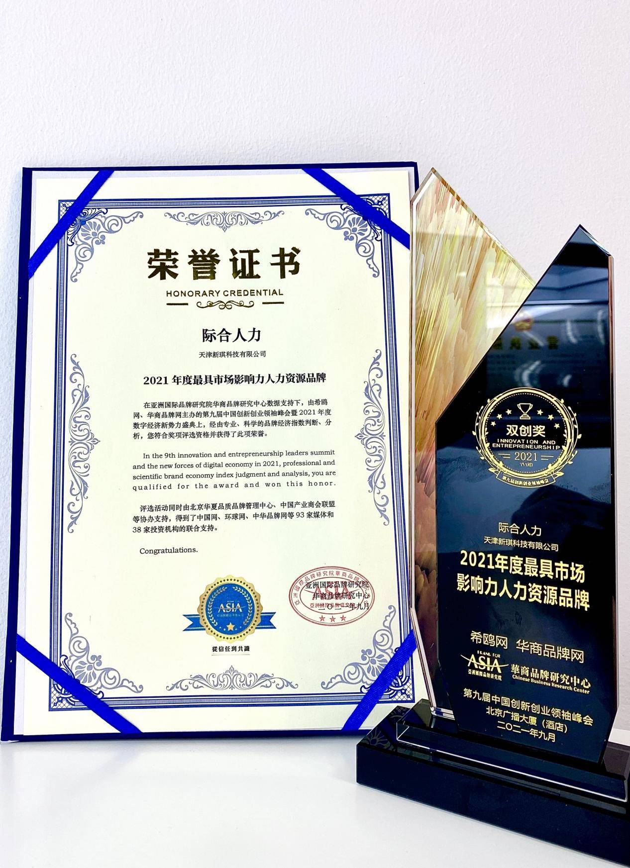 在活动的最后,第九届创新创业领袖峰会年度数字经济新势力品牌及其他系列奖项荣誉揭晓,凭借创新力及在行业内的影响力,际合人力获评2021年度最具市场影响力人力资源品牌。
