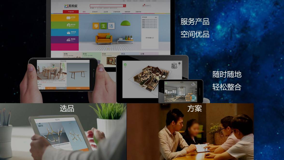5、交易流程数字化:用户可以随时随地通过手机、电脑、电视、VR设备……等各种终端接入彩构家的平台,可以选着躺着、坐着、趴着、运动……等各种舒适的姿势,在不同的“元宇宙”中畅游、挑选自己喜欢的产品或服务,也可以根据自己的想法,亲自动手打造属于自己的家生活空间,实时获取想要的详情介绍、预算统计……等各种资讯。在线与产品服务商进行沟通,确定方案后即可一键与方案中所选用的各种商家达成交易。